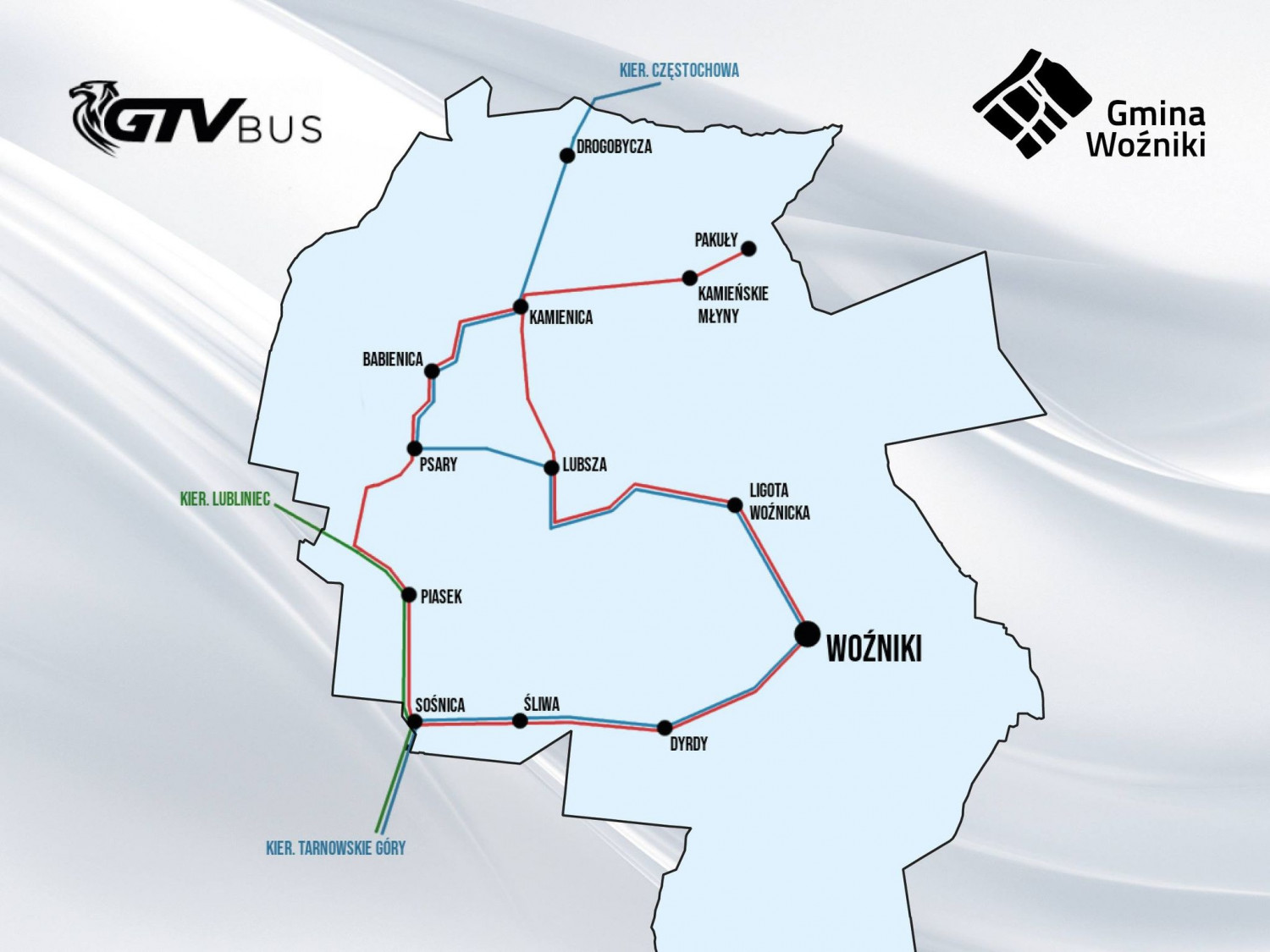 Od 1 lipca w dni robocze bus będzie jeździ na linii Częstochowa – Tarnowskie Góry (która na terenie gminy Woźniki także będzie darmowa). Powstaje także nowa okrężna linia gminna pętla Piasek – Piasek.– Takie rozwiązanie pozwoli na darmową komunikację wewnątrz gminy Woźniki m.in. połączenia z siedzibą UM w Woźnikach. Na przystanku "Piasek" podróżni mogą przesiąść się na linię do Lublińca, którą do uzyskania nowych zezwoleń będzie obsługiwała firma "Trelek", według obecnie obowiązującego rozkładu jazdy – tłumaczył prezes GTVBUS.