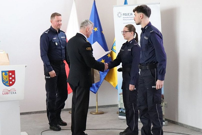 Komendant PSP wyróżnił natomiast dwóch policjantów lublinieckiej komendy, którzy wykazali się determinacją i szybkością działania podczas pożaru budynków zakładu tapicerskiego w Sadowie w październiku 2025 r.