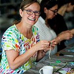 Prowadząca warsztaty Katarzyna Biedrycka krok po kroku odkrywała tajniki haftu sutasz, wykonując wisiorek według własnej kompozycji.