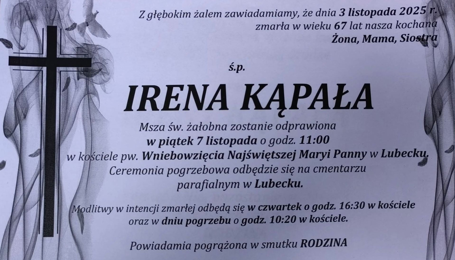 Śp. Irena Kąpała miała 67 lat, zmarła po długiej i ciężkiej chorobie.
